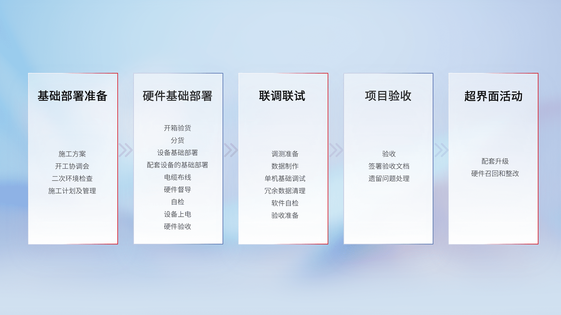 从基础部署准备、、、硬件基础部署、、、联调联试、、、项目验收、、越界面活动的全过程可追溯,,,保证施工质量和进度。。。。